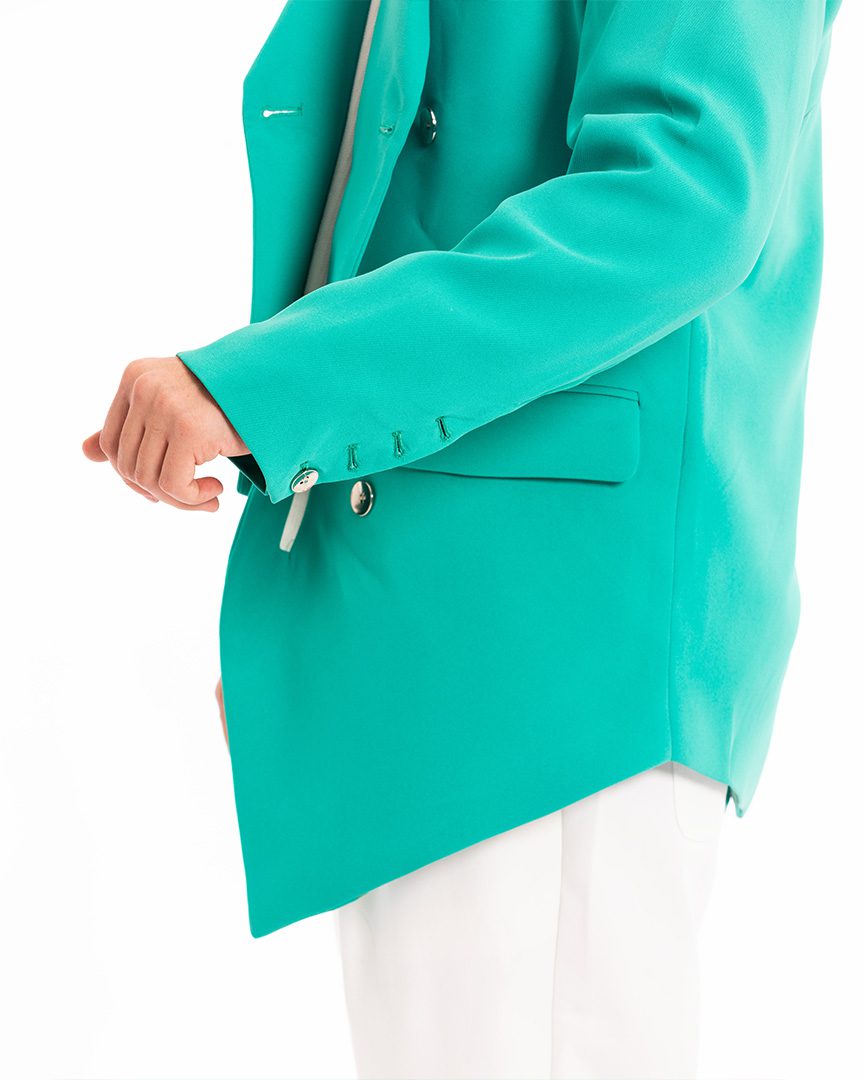 جاكيت مبطن بصدر واحد من القماش المنسوج مع طية وزرين في الأمام. يتميز بقصة وجيوب أمامية
