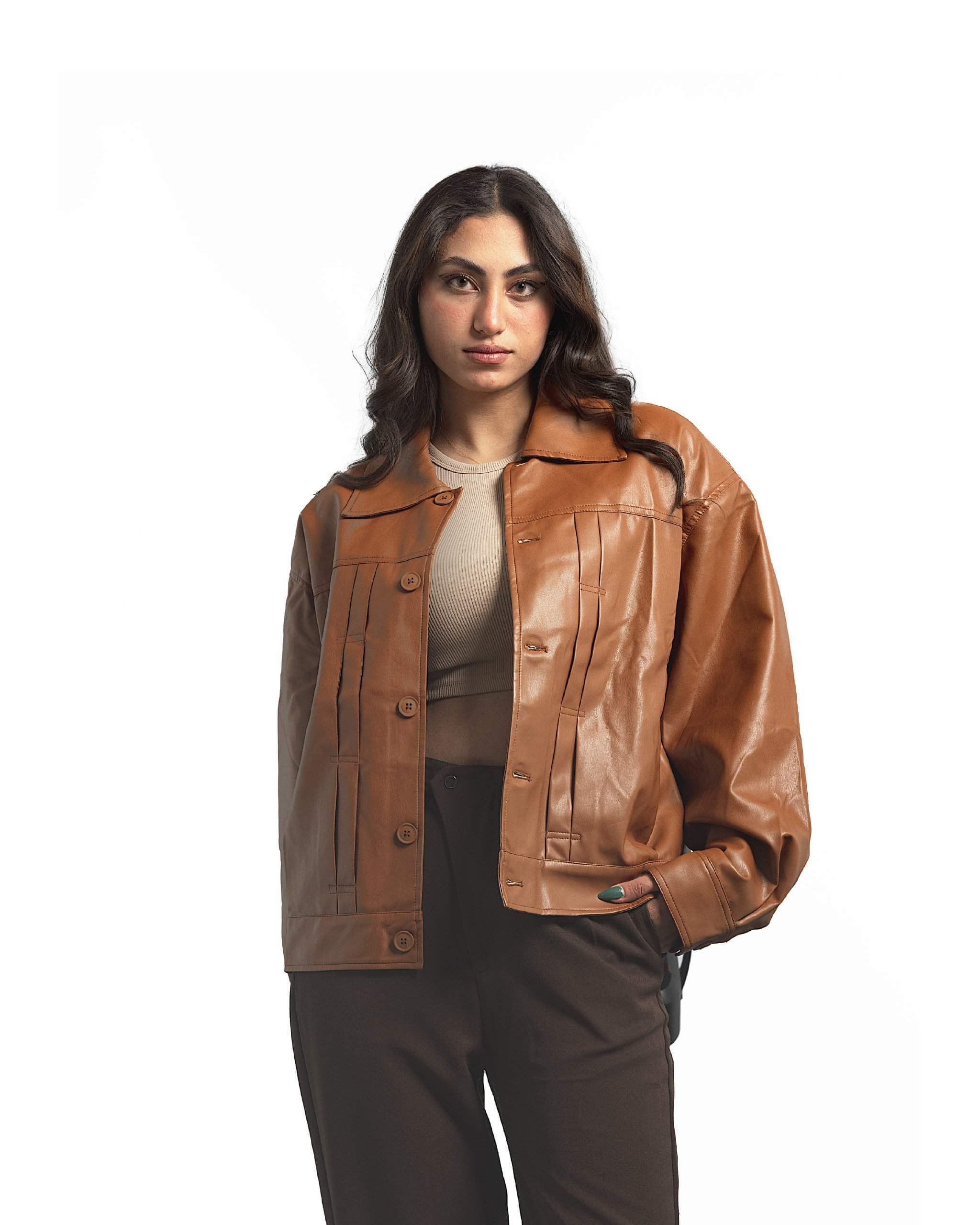 جاكيت بقصة مستقيمة مع سحاب مغطى وأزرار خاطفة. يتميز بياقة قميص مصنوع من جلد .